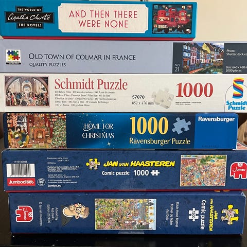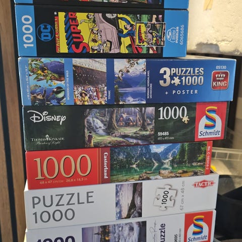 Pakke med flere puslespill og brettspill fra blant annet Ravensburger og andre produsenter, samt noen brettspill i originalesker.