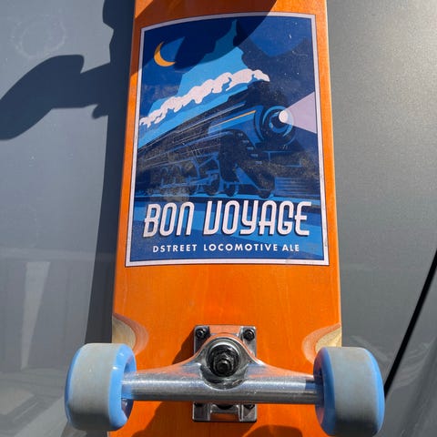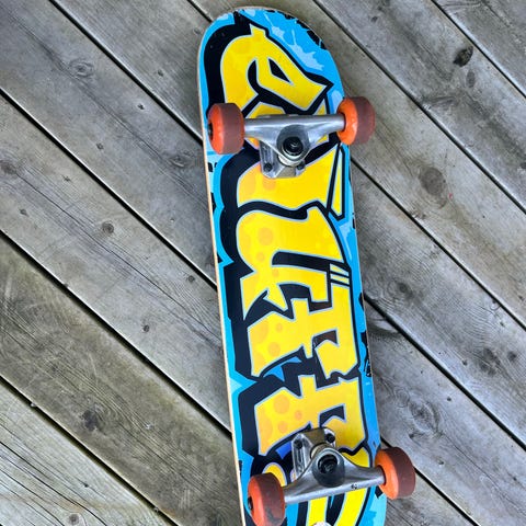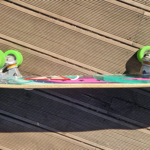 Komplett skateboard med oransje underside og grafisk motiv. Brettet har svart grip tape på oversiden, hvite hjul og metalltrucker. Egner seg til vanlig bruk på asfalt, ramper eller skatepark. Størrelse på brett og hjul er ikke oppgitt, se bilder for detaljer på form og oppsett. Brettet er lite brukt og eieren kan ikke mye om skateboard