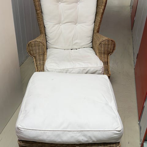 Stol med puff. Trekk kan taes av og vaskes i maskin. En stykke av rottingen ødelagt/borte på ene ermstøtten ellers hel og pen.( se bilde .)