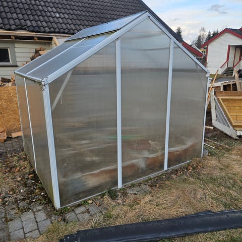 Pent brukt lite drivhus, 120x80 cm. 4 takluker kan åpnes, herdet glass i aluminiumsramme. 2 pallekarmer samt pall følger med.