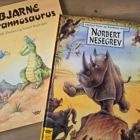 Her kommer to bøker om dinosaurer, den ene helt ny, den andre er bladd i.