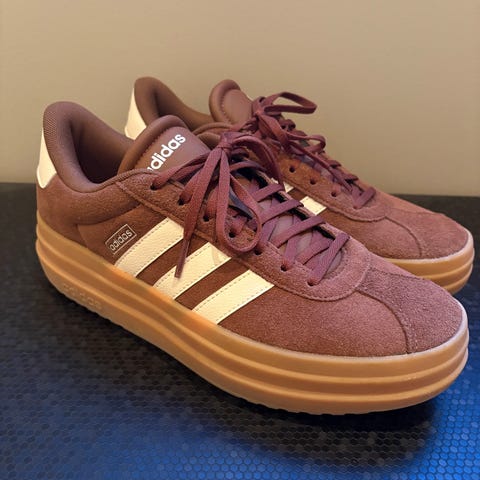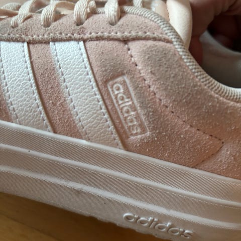 Adidas VL Court Bold sneakers i størrelse 38. Modellen har overdel i burgunderrødt semsket materiale med hvite Adidas-striper på sidene og rosa detalj bak hælen. Skoene har kraftig, lys brun gummisåle med Adidas-logo på siden. Klassisk snøring foran og lav ankelhøyde. Egnet som fritids- og hverdagssko.