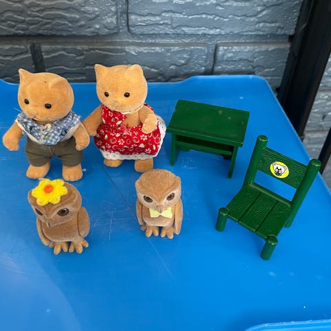 Sylvanian Families lekesett med kattfigur voksen og kattunge samt tilbehør. Settet inneholder blant annet ryggsekk, lykt, kart og kikkert. Figurenes klær og tilbehør er av plast og tekstil. Egnet som tilbehør til andre Sylvanian Families-hus og -miljøer, og for rollelek med dyrefigurer i mindre skala.