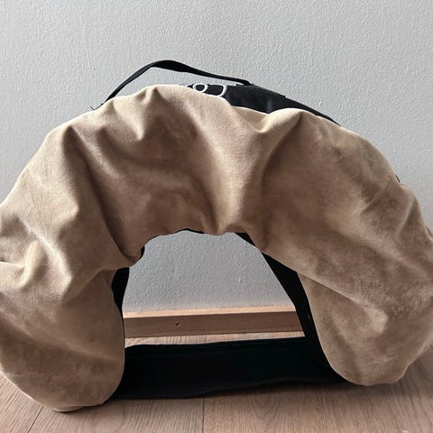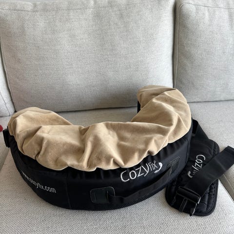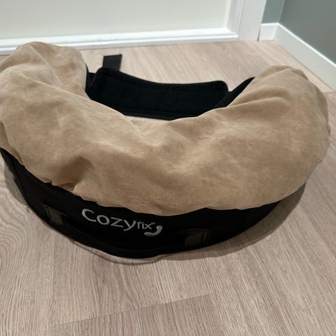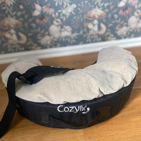 Cozyfix ammepute i beige. Puten festes rundt livet med justerbar stropp og spenne for å gi stabil støtte ved amming. Utformet som en buet pute som legges rundt kroppen slik at barnet kan ligge stødig. Tekstiltrekk i mykt stoff. Egnet til bruk hjemme eller på reise for å avlaste skuldre og armer under amming.
