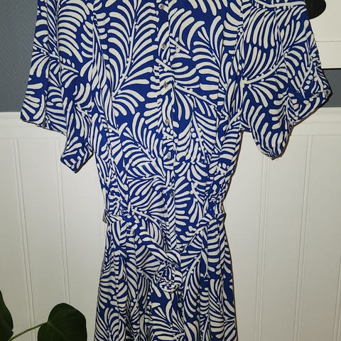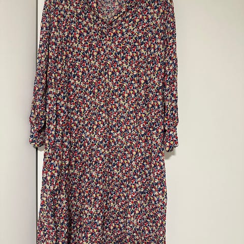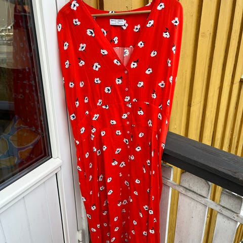 H&M omslagskjole for dame i størrelse XXL. Kjolen er rød med hvitt blomsterprint og laget i viskose. Modellen har omslagssnitt med V-utringning og knytebelte i livet. Lange ermer med lett volum. Stoffet er tynt og faller mykt. Passer godt som lett sommerkjole eller til hverdagsbruk.
