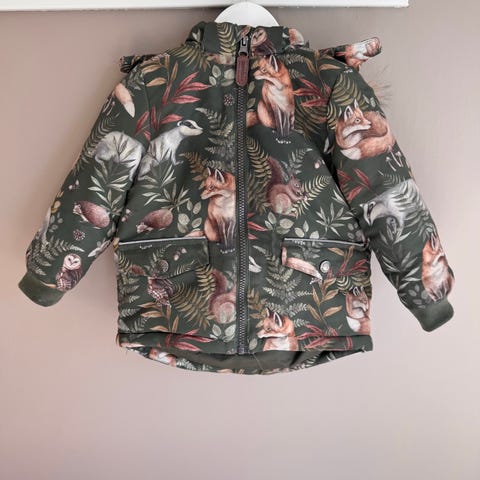 Newbie vattert jakke med dyremønster, str 86 stor og romslig i str med hette som kan kneppes av☺️