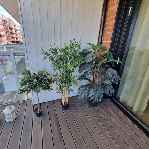 Dekorativt plantebord med 3 plast,- og 3 terracottapotter selges, da det ikke brukes!