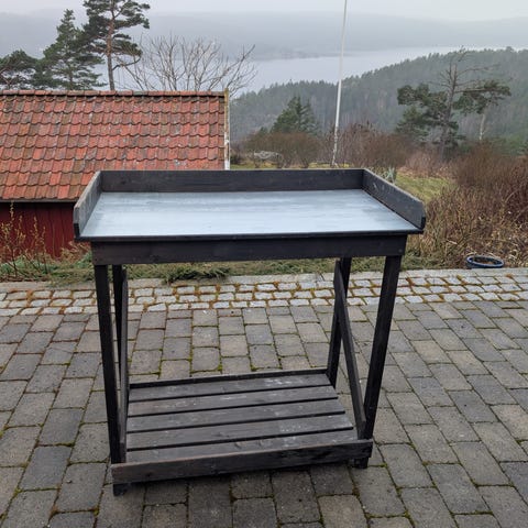 Plantingsbord med hylle i svart treverk og arbeidsplate i metall. Bordet har en opphøyd kant rundt arbeidsflaten som holder jord og utstyr på plass. Under arbeidsflaten er det en ekstra hylle for oppbevaring av potter og annet hageutstyr. Egner seg til ompotting, såing og annet hagearbeid på terrasse, balkong eller i hage.
