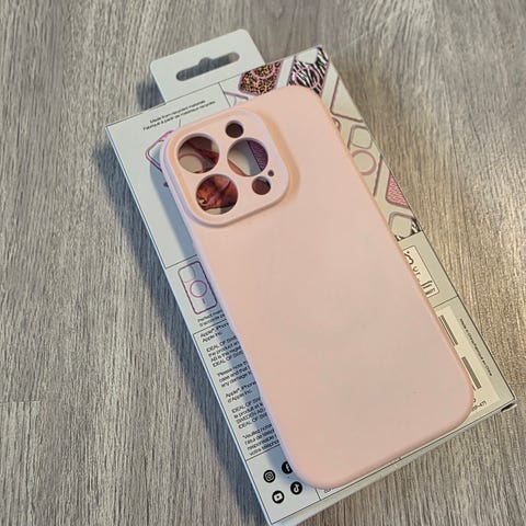 Apple telefondeksel lommebokdeksel i rosa farge. Dekselet har kortlommer på innsiden, inkludert gjennomsiktig lomme for ID-kort, og lukkes med trykknapp. Utsiden har markering for trådløs lading. Innsiden av selve dekselet er i strukturert materiale for bedre støtdemping og grep. Passform er tilpasset en Apple-telefon med utsparing for kamera og knapper.