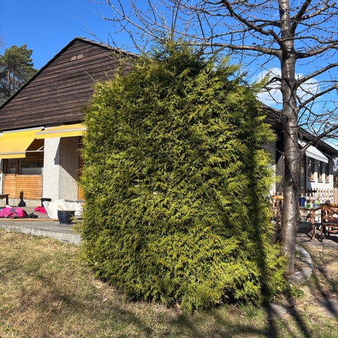 Thuja hekkplanter i grønn farge. Plantene står tett og danner en sammenhengende, vintergrønn hekk som egner seg som avgrensing eller skjerming i hage og uteområde. Passer til beplantning langs tomtegrenser, innkjørsler eller rundt uteplasser der man ønsker en jevn, grønn hekk gjennom året.