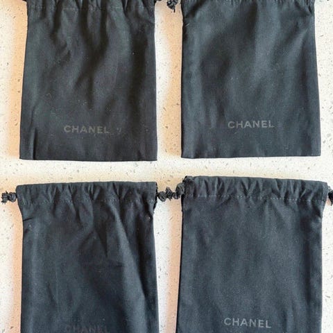 Helt ny og ubrukt liten dustbag fra Chanel. Laget i hvit bomull med logo og sort snor.