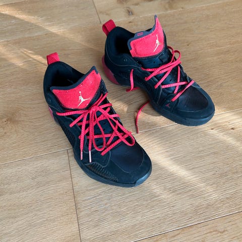 Jordan basketsko i rødt. Modellen har snøring foran, polstret hælparti og mellomsåle i lys kontrastfarge. Overdelen består av tekstil og syntetiske materialer med karakteristiske Jordan-detaljer på sidene. Det er netting på sidene for god lufting.