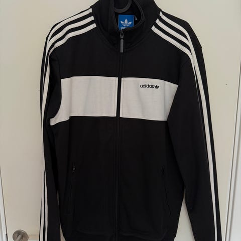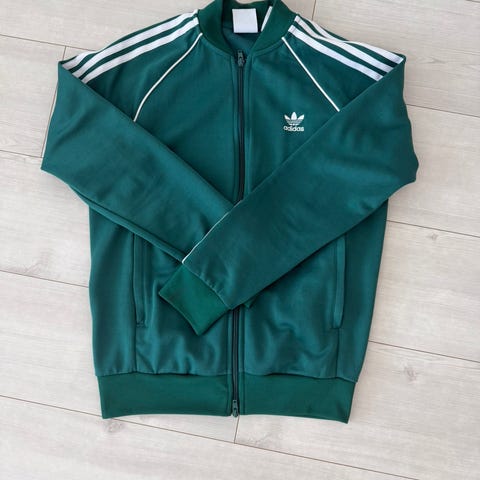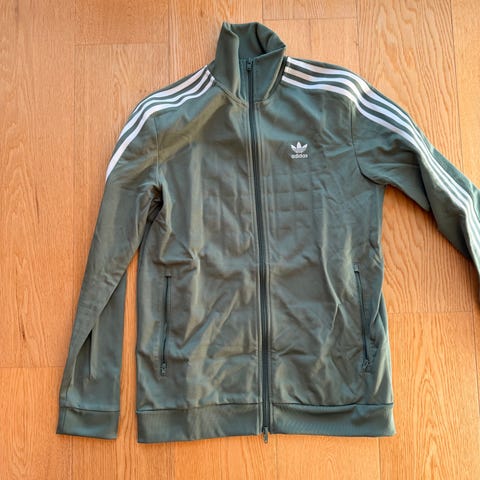 Adidas Originals treningsjakke for herre i størrelse M. Jakken er grønn med hvite Adidas-striper langs ermene og lite Adidas Originals-logo på brystet. Modellen har hel glidelås foran, ribbestrikket krage, mansjetter og linning, samt sidelommer. Egnet som fritids- eller treningsjakke.