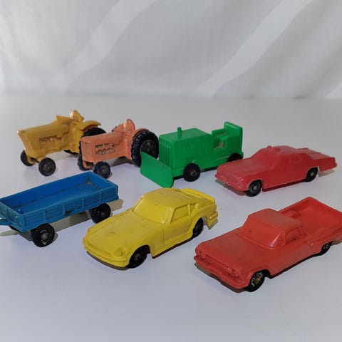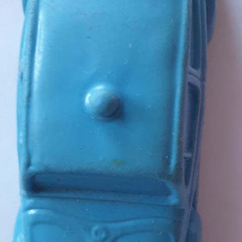 Tomte lekebil pickup i blå plast. Bilen er en enkel pickup-modell med åpen lasteplan og oransje hjul. Karosseriet er støpt i plast med markering av frontrute, frontlys og grill. Bak påbilen står det «Tomte Stavanger - Norway», som viser at den er produsert i Norge.