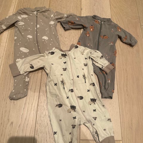 Selger to pysjer fra newbie og kappahl i str 62. Den lyse er knapt brukt, den mintgrønne er brukt litt mer. Fortsatt masse bruk igjen i seg! Supergod kvalitet, og myke mot den sarte babyhuden 🥰