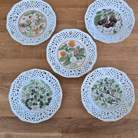 Nydelig veldig gamle frukt tallerkner. Disse er helt skjønne og utrolig fine antikviteter. 5 stk og selges samlet for 800.-