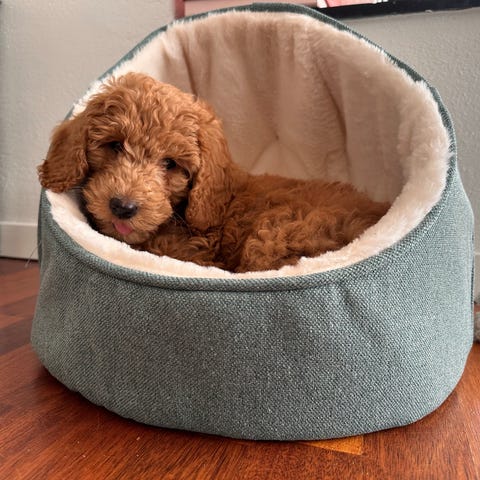 Rund hundeseng i grå farge. Putens form gir et mykt og omsluttende liggeområde som kan passe for mindre hunder eller katter. Overflaten er fluffy og myk og gir et behagelig underlag for hvile og søvn. Egner seg til bruk innendørs, for eksempel i stue eller soverom, som fast liggeplass.