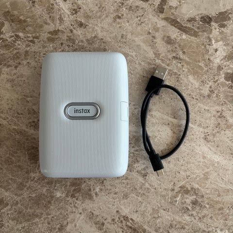 Lades via USB-C-port på siden. Lokket på baksiden åpnes for montering av Instax Mini-filmkassett.