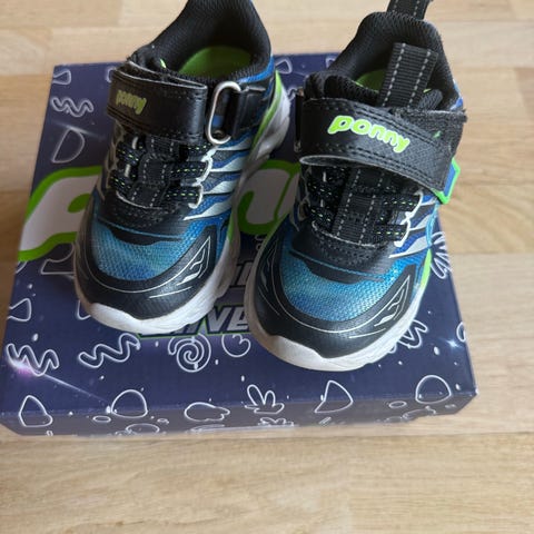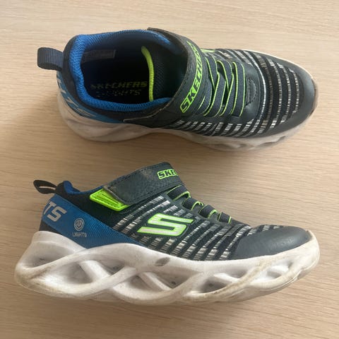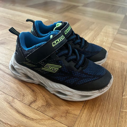 Skechers joggesko til gutt i størrelse 27. kjøpt nye og brukt av ett barn. Blinker kun på venstre sko, høyre skoen blinker ikke.