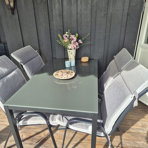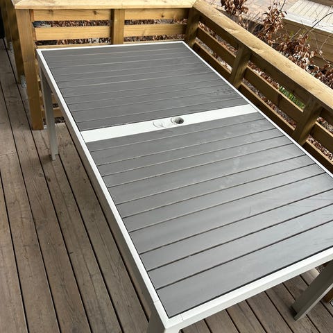 Grått hagebord med bordplate i non-wood med ramme i pulverlakkert aluminium.