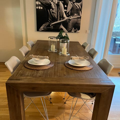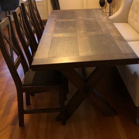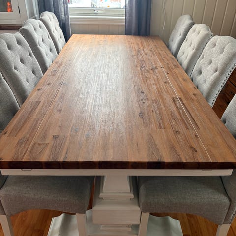 Spisebord i tre med rektangulær bordplate i gråbrun finish. Bordplaten består av felter med synlig trestruktur som gir et rustikt preg. Understellet er i massivt tre med kryssben og kraftige bunnplater for stabilitet. Egner seg som spisebord til flere personer, for eksempel på kjøkken, spisestue eller innglasset veranda.