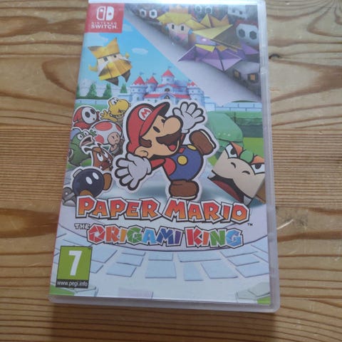 Nintendo Switch Paper Mario The Origami King spill. Fysisk spillkassett for Nintendo Switch-konsoll. Omslaget viser aldersmerking PEGI 7. Spillet tilhører Paper Mario-serien og er et eventyr- og plattformspill der spilleren styrer Mario i en verden med origami-tema på Nintendo Switch.