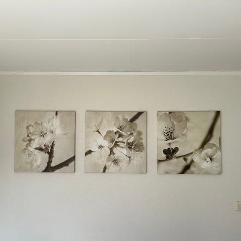 3 "sammenhengende" bilder av hvit blomst kr 120. 56x56 cm