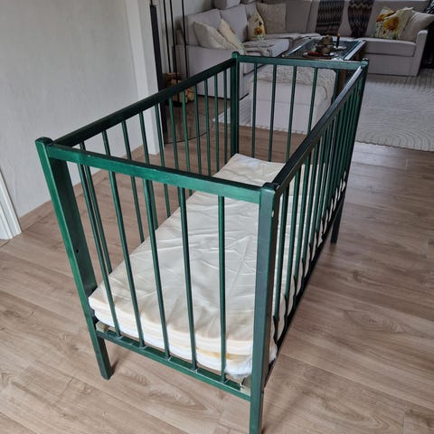 Brukt barneseng fylgjer med madrass og teppe over madrass.
