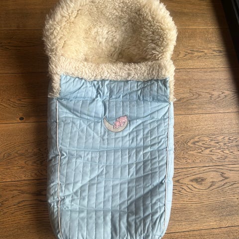 Myk og varm vognpose med lam-motiv, god til kalde dager. Hel og fin