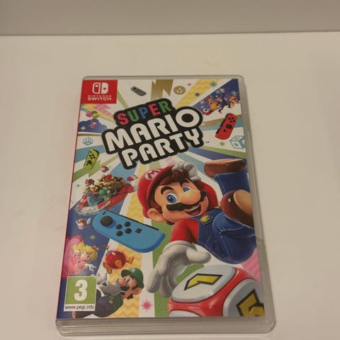 Nintendo Switch Super Mario Party spill. Fysisk spill til Nintendo Switch-konsoll. Omslag viser PEGI 3 aldersmerking. Partyspill med figurer fra Mario-universet, beregnet for bruk med Joy-Con-kontrollere på Nintendo Switch.
