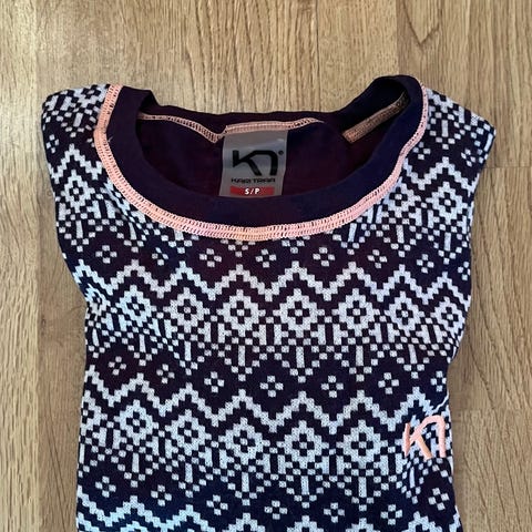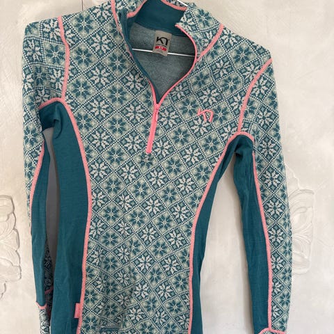 Trøyen har lang erm og halv glidelås i halsen. Den er grå med tradisjonelt mønster og rosa detaljer langs glidelås og sømmer.