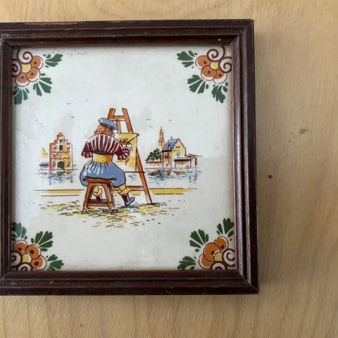 Dekorativ fjøl med keramikkflis i Delft-stil – Vintage / Nederland