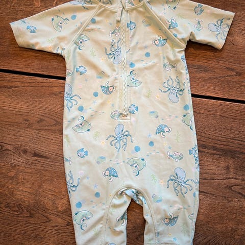 UV-drakt i str 74/80, samt lue med brem og forlengelse i nakke.