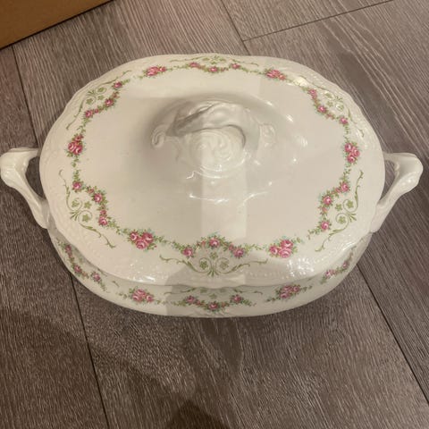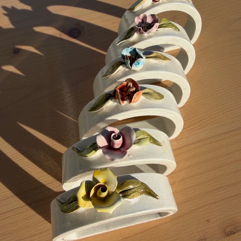 Vintage serviettholder i keramikk med håndmalt blomstermotiv.