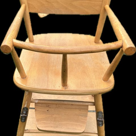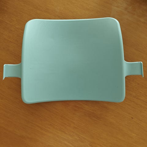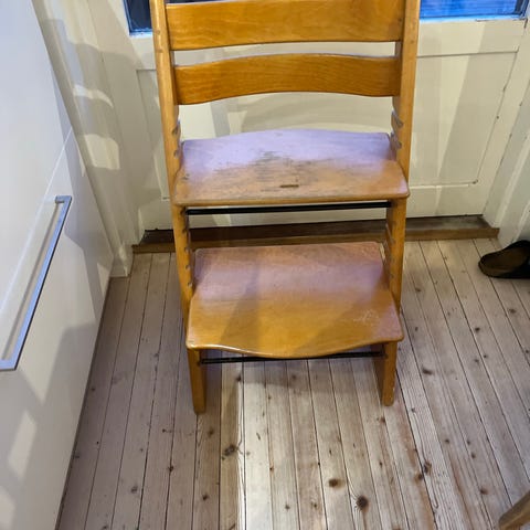 Stokke høy barnestol i svart. Stolen har fotplate og sitteplate som kan justeres i høyden.