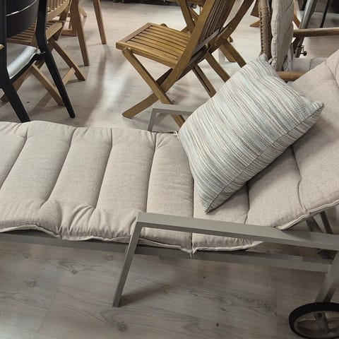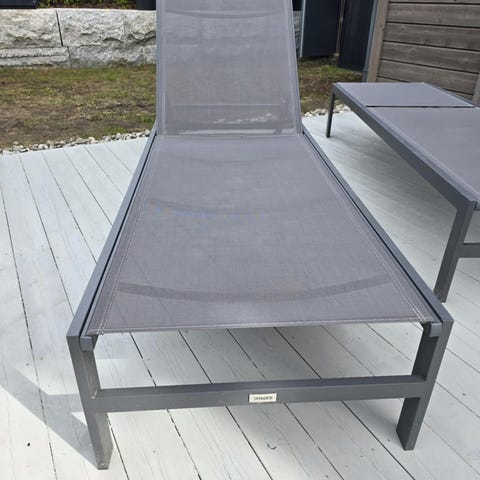 Solseng med soltak kjøpt på Beliani sommeren 2025. Kan deles opp i to deler med et lite bord med herda glassplate.