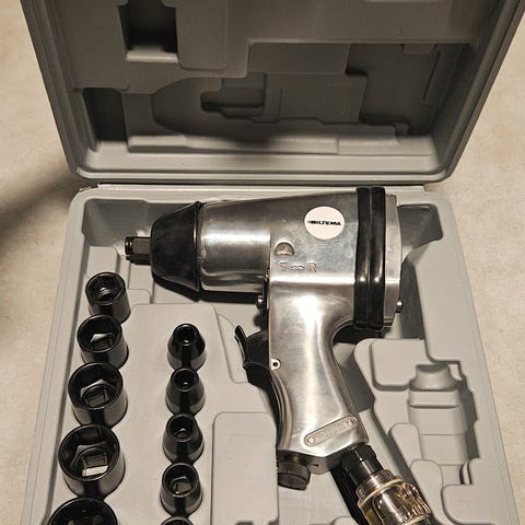 Sett med batteridrevet muttertrekker på 18V i plastkoffert. I kofferten følger det med lader, batteri, ulike piper og et lite manometer/trykklufttilbehør som vist på bildene. Verktøyet har pistolgrep med gummiert håndtak og betjeningsknapper lett tilgjengelig.