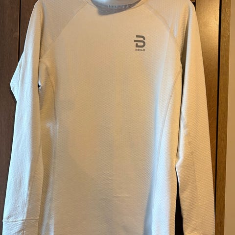 Bjørn Dæhlie langermet løpetrøye i størrelse M. Trøyen er hvit med oransje sømmer og ribbestruktur i stoffet. Laget av 100 % polyester. Modellen har rund hals og forlenget rygg. Egnet som teknisk overdel til løping, ski og annen trening for unisex-brukere. Stoffet er lett og hurtigtørkende, og sømmene er plassert for god bevegelsesfrihet.
