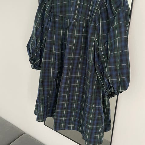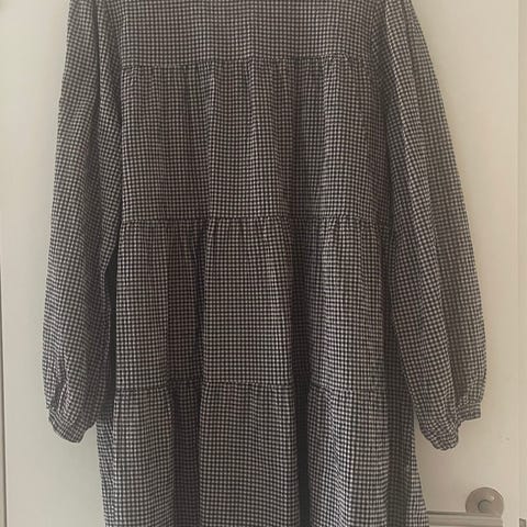 Untold Stories Mercer Dress hverdagskjole for dame i størrelse XS. Kjolen er brun med små rutemønster og har lange ermer. Modellen har en løs, rett passform med voluminøse skjørtpartier i flere lag. Materialet er en bomullsblanding (57 % bomull, 42 % polyester, 1 % elastan) som gir et mykt stoff med litt stretch. Egnet som hverdagskjole og til bruk både inne og ute avhengig av sesong.