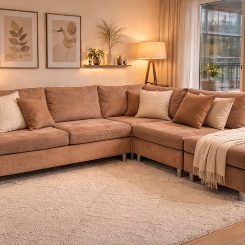 Sofasett bestående av to 3-seters sofaer i rustrød tekstil.