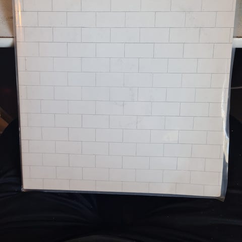 Pink Floyd The Wall vinylalbum. Utgaven består av dobbelt-LP med hvit omslagsdesign med mursteinsmotiv. Innersleeves har trykte tekster til låtene og grafiske illustrasjoner.
