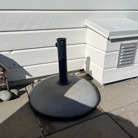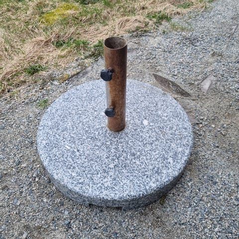 Betong parasollfot i svart. Foten har firkantet base 45x45 cm og rør for parasollstang med strammeskrue. Egnet for bruk på terrasse, balkong eller i hage for å gi stabilitet til parasoll. Foten har hjul på undersiden for enklere forflytning. Vekt 47 kg.