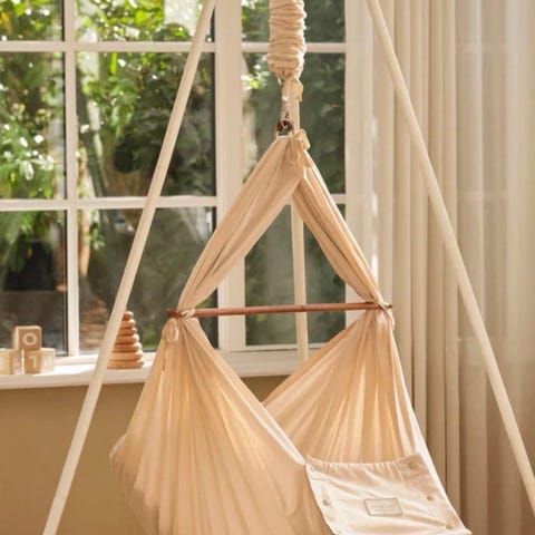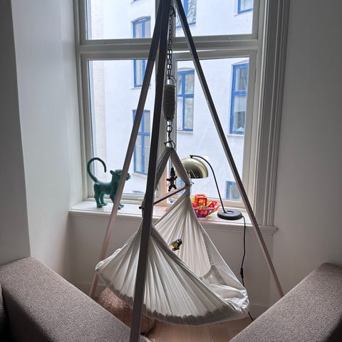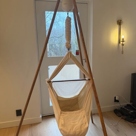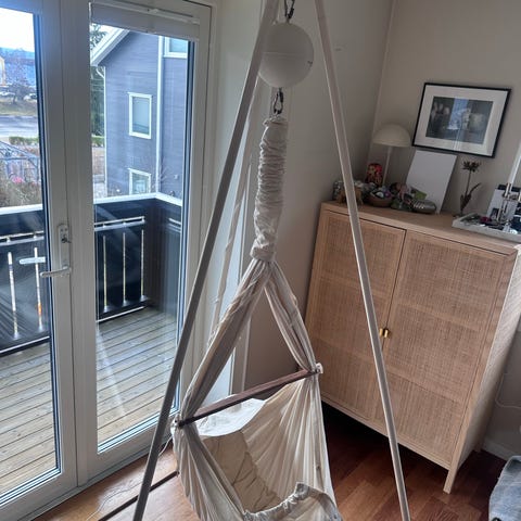 Vuggen henges opp i taket, på dørkarmer eller rundt bjelke. Stativ kan også kjøpes hvis det er ønskelig at den står på gulvet. Den har en integrert madrass i bunnen og stoffkanter som omslutter barnet.