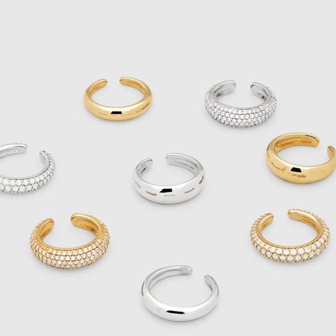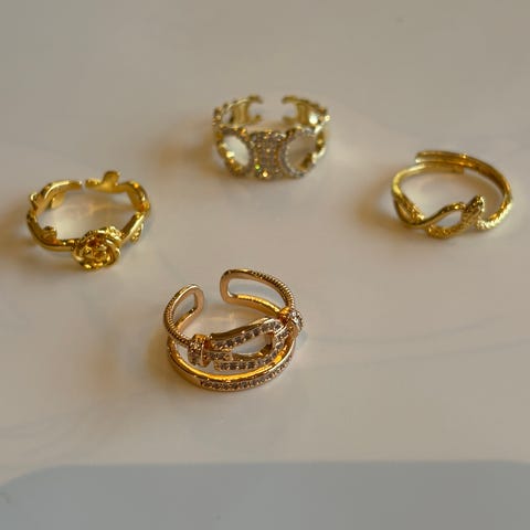 🤍Sett med flere tynne ringer i ulike strukturer og fasonger, blant annet glatte, riflede og bølgede varianter. Noen av ringene har små dekorative detaljer.