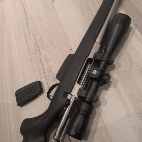 Nydelig og lite skutt våpen! Kappet løp på 45 cm,frittliggende pipe og selvfølgelig beddet.Hurtigmontasjer gjør at det å skifte mellom sikter gir 100% presise skudd.Brukte selv å skifte fra Aimpoint til kikkert ute på jakt, avhengig av postering ☺️.Er helt fantastisk å skyte med og ligger som støpt i hendene.Selges med GRS stokk, Svemko Hunter1.0, Aimpoint 9000 og 65 hjemmeladda skudd til ælgen!Alt klart til jakt!