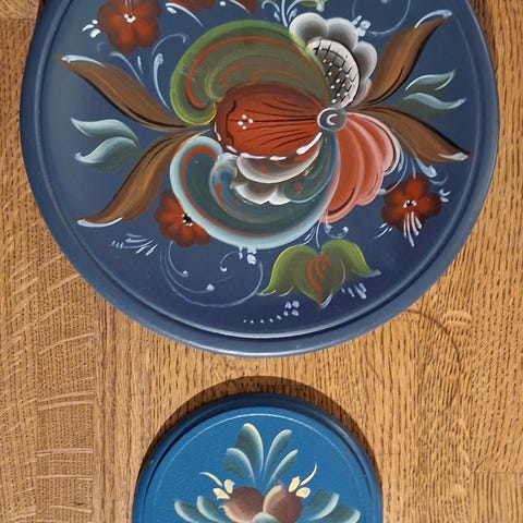 5 stk vakkre trefat med veggoppheng - 23 cm. i diameter. Gi bud ...