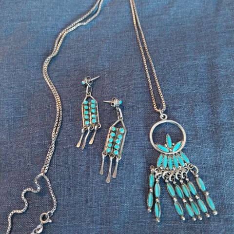 Smykkesett halskjede med lærreim og øredobber.