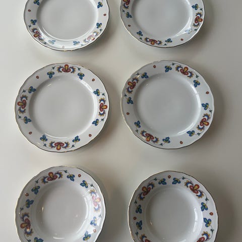 Porsgrund serveringsfat og skåler i hvitt porselen. Settet består av rektangulære og kvadratiske fat og skåler i ulike størrelser, egnet til servering av forretter, tilbehør, snacks eller desserter. Nøytral hvit farge gjør at delene kan kombineres med annet servise. Produsentstempel fra Porsgrund på undersiden av fatene.
