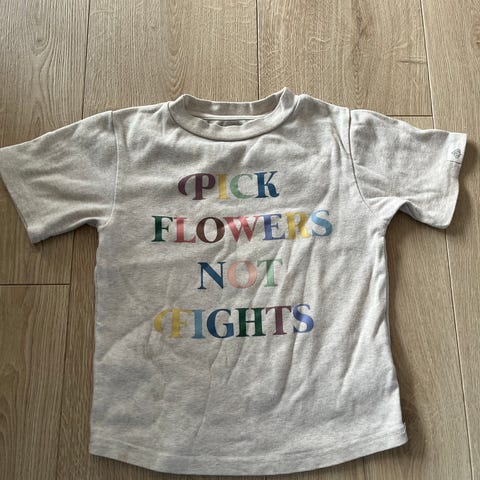 Gullkorn genser for barn i størrelse 98-104. Genseren er beige og laget i bomull. Den har rund hals, lange ermer med ribbekanter og ribbekant nederst. På brystet er det trykk med teksten «Pick flowers not fights» i flere farger. Unisex-modell som passer både til hverdagsbruk og barnehage/skole.