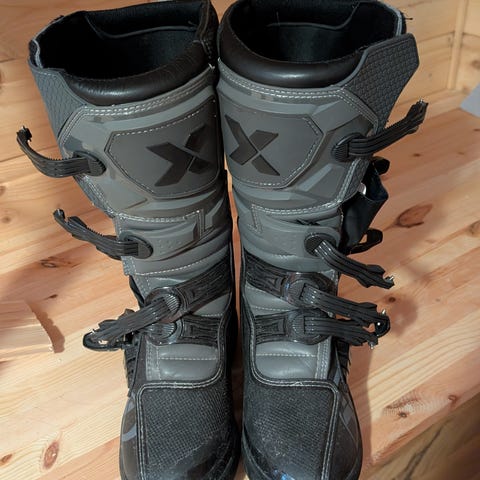 Prexport motorsykkelstøvler i semsket skinn. Har aldri vært brukt, bare prøvd på. Står 44 inni støvelen og 43 nede på sålen, så litt usikker på størrelsen.